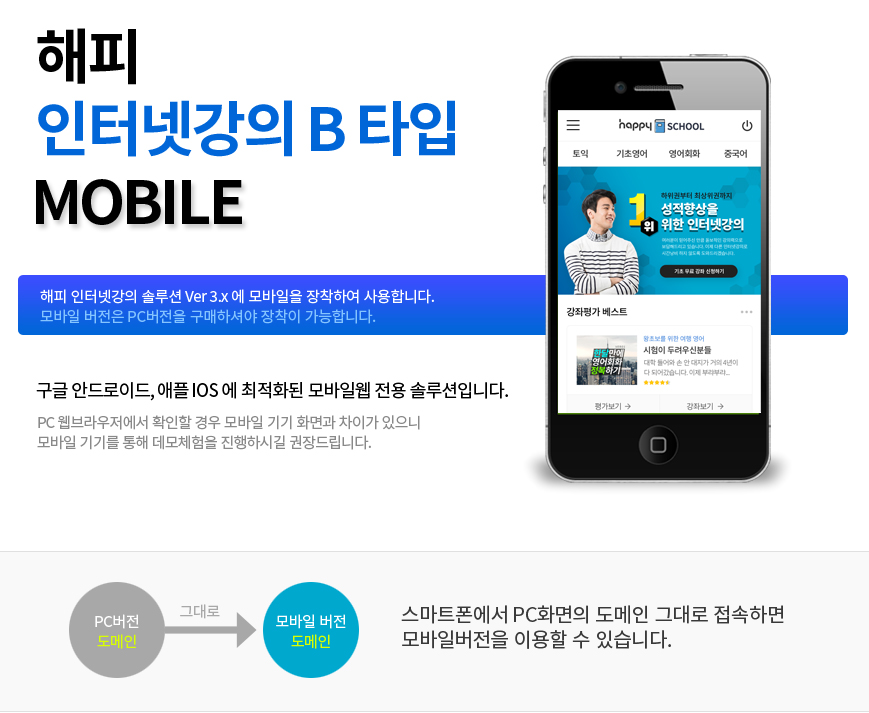 해피 인터넷강의 솔루션 타입B 모바일 Ver2.0 (장착옵션) 이 새롭게 버전업 하였습니다.