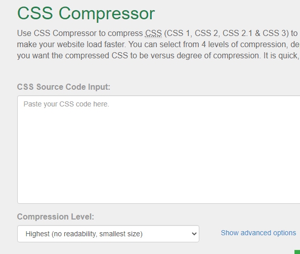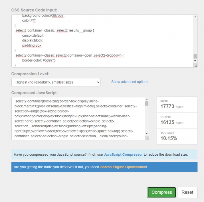 소스코드창에 작성한 css를 입력후 css압축 레벨을 선택후 compress 버튼을 누르면 작업이 시작됩니다.