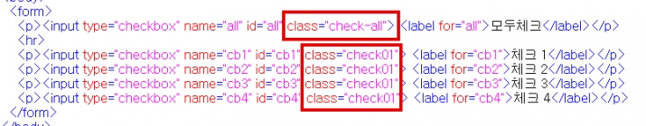 위 처럼 check-all 이라는 class 와 check01 이라는 class 를 이용하여 적용되는 방식입니다.