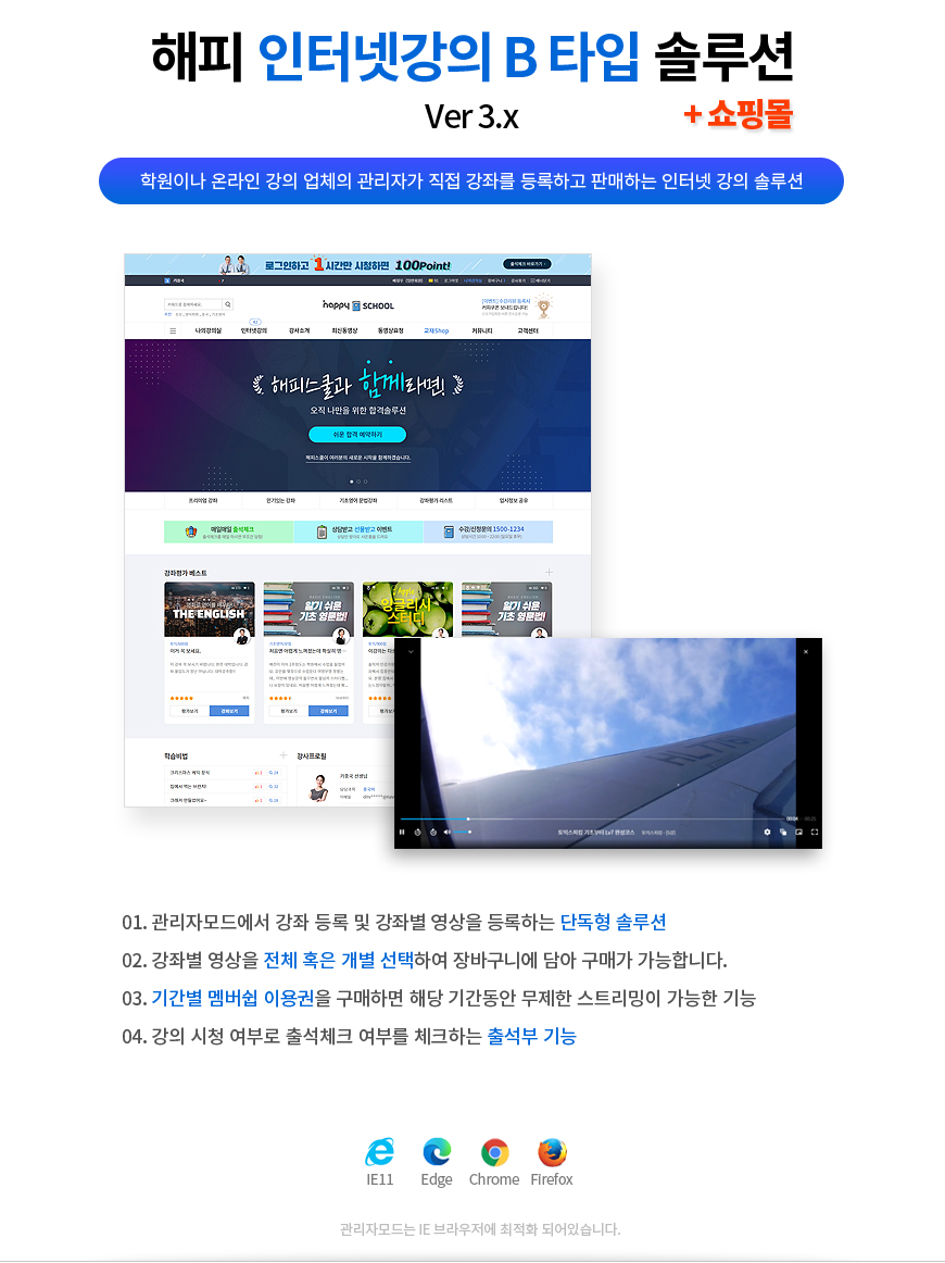 해피 인터넷강의+쇼핑몰 솔루션 타입B Ver3.0 [단독형 보안플레이어] 이 새롭게 버전업 하였습니다.