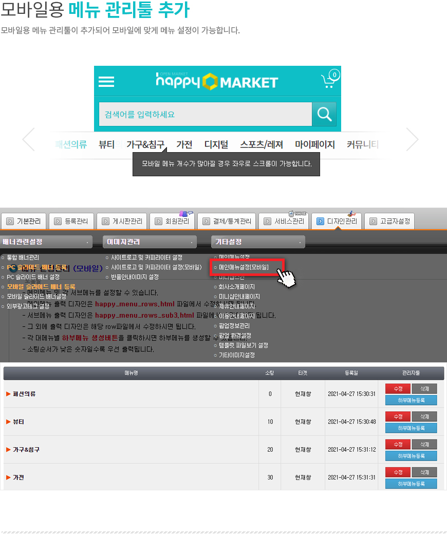 [해피CGI][cgimall] 해피 오픈마켓 솔루션 모바일 Ver3.1 (타입D 장착옵션)로 업그레이드 되었습니다