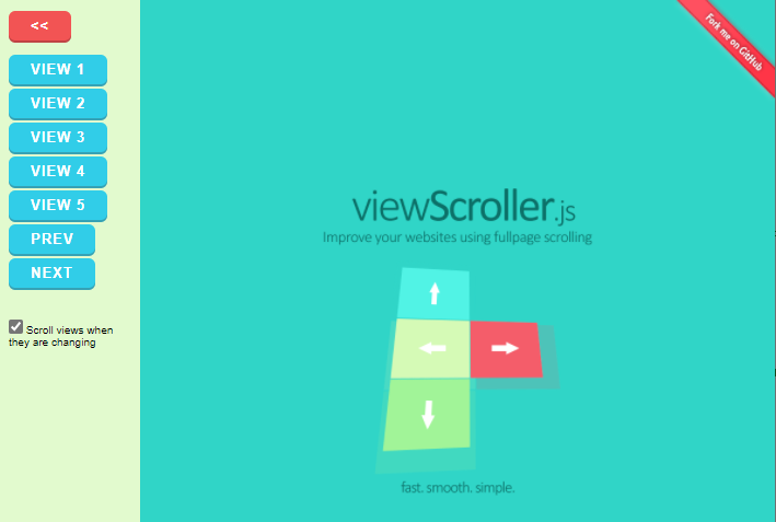 - ViewScroller.js는 전체 페이지 스크롤 웹 사이트를 만들 수있는 사용하기 쉬운 솔루션입니다.