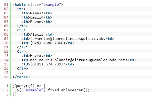 2. Table 소스코드를 코딩하고, fixedTableHeader 플러그인을 호출합니다.