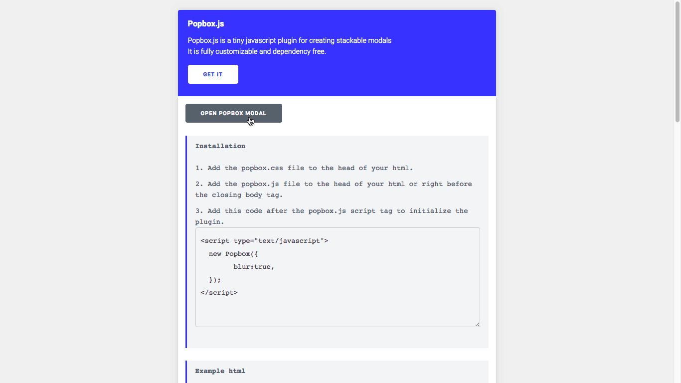<div data-popbox-id="mypopbox1" class="popbox"> <div class="popbox_container"> Popbox content 1 <button data-popbox-close="mypopbox1">Close</button> </div> </div> <div data-popbox-id="mypopbox2" class="popbox"> <div class="popbox_container"> Popbox content 2 </div> <button data-popbox-close="mypopbox2">Close</button> </div> <div class="popbox_main_content"> Main content of the page <button data-popbox-target="mypopbox1"> Open mypopbox 1 </button> <button data-popbox-target="mypopbox2"> Open mypopbox 2 </button>   </div>