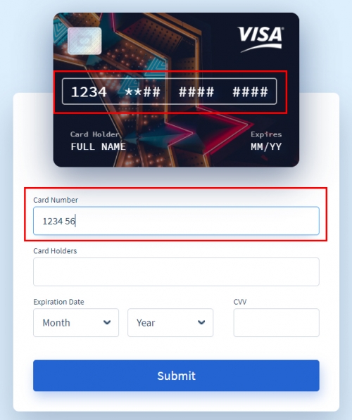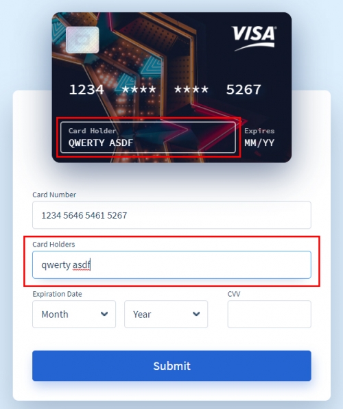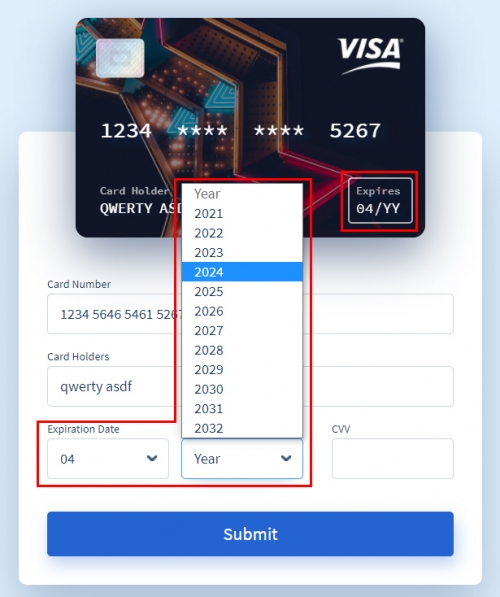 카드번호, 사용자, 년도 등 정보를 입력하면 상단에 있는 입체 카드에도 입력된 정보가 반영됩니다.