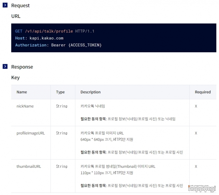 사용자의 프로필을 받아오는 API 이용방법은 아래 페이지에서 확인이 가능 합니다.