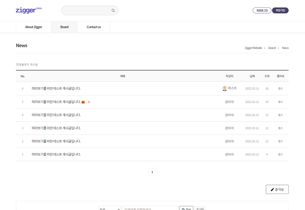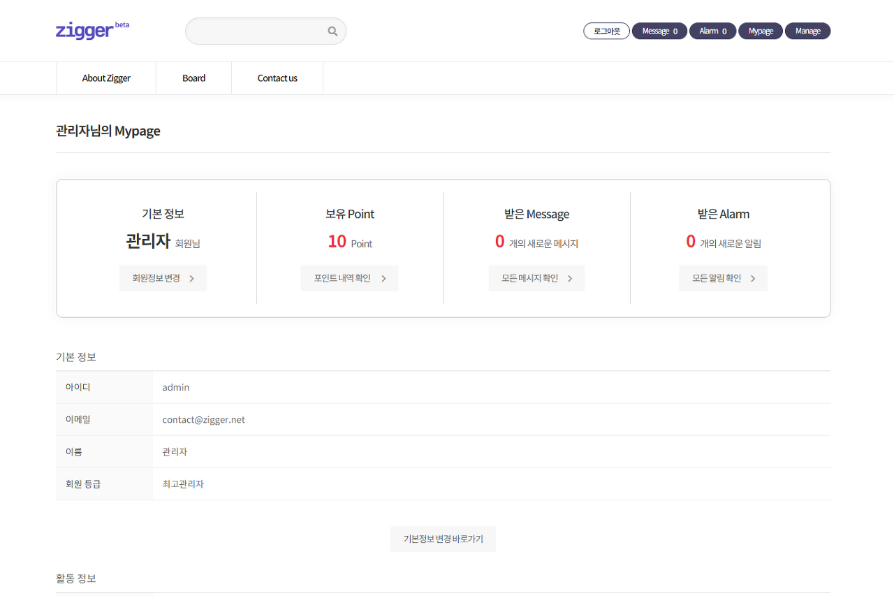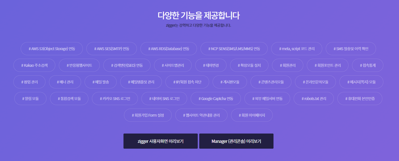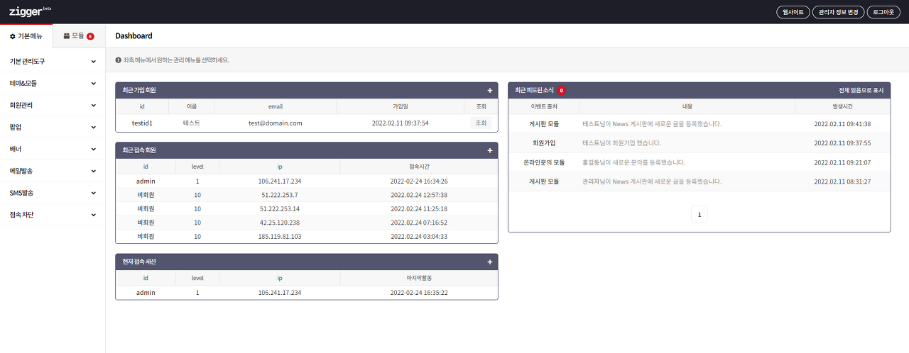 zigger는 회원관리, 게시판, 배너관리, 팝업관리 등 웹사이트 구축을 위해 강력한 기능을 제공하는 CMS입니다.