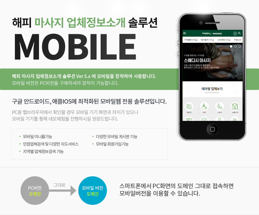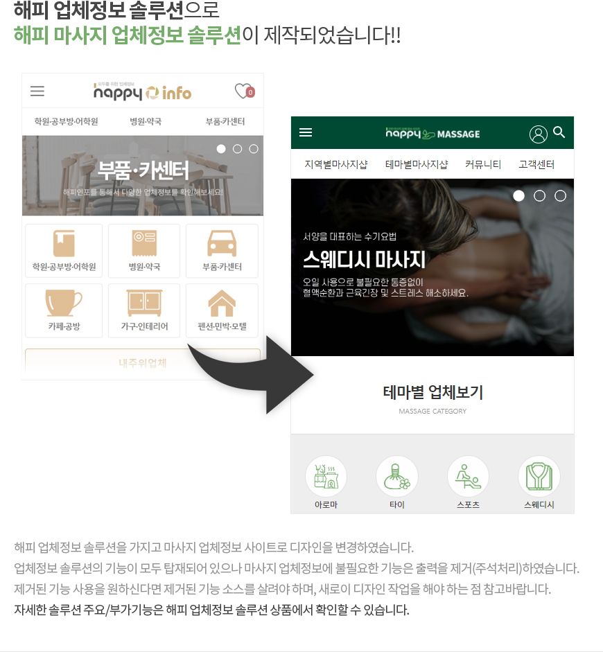 [해피CGI][cgimall][출시] 해피 마사지 업체정보 솔루션 모바일 Ver3.1 (실시간예약 비내장,장착옵션)이 새롭게 출시되었습니다.