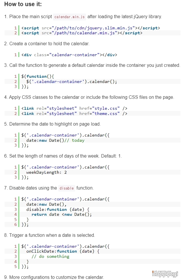 사용방법은 https://www.jqueryscript.net/time-clock/powerful-calendar.html 페이지에서 확인이 가능 합니다.