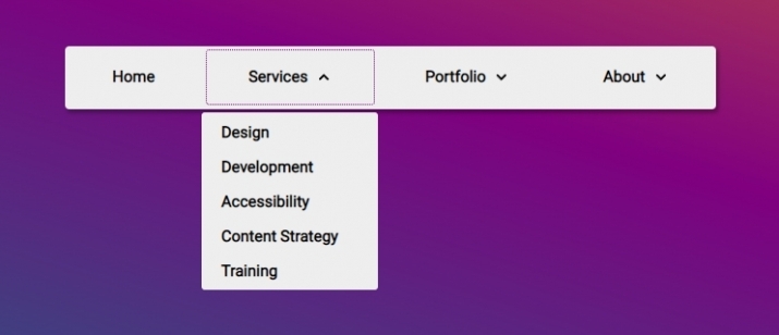 메뉴는 클릭, 탭 또는 키보드 / 키로 열 수 있는 1단계 드롭다운 메뉴 와 함께 제공 됩니다(포커스가 있을 때)