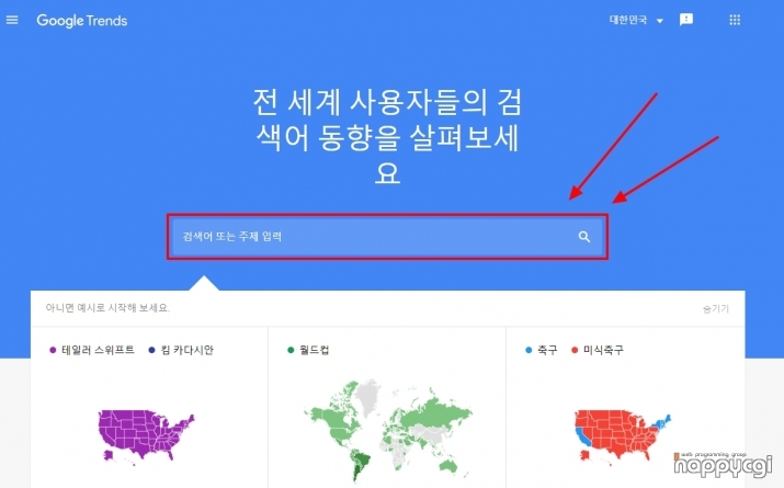 https://trends.google.co.kr/ 페이지로 접속시 검색어를 입력 할 수 있습니다.
