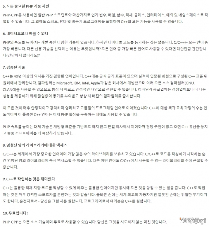 아래 스크린샷은 한글로 http://www.php-cpp.com/documentation/ten-reasons-for-using-php-cpp 페이지를 번역한 결과 입니다.