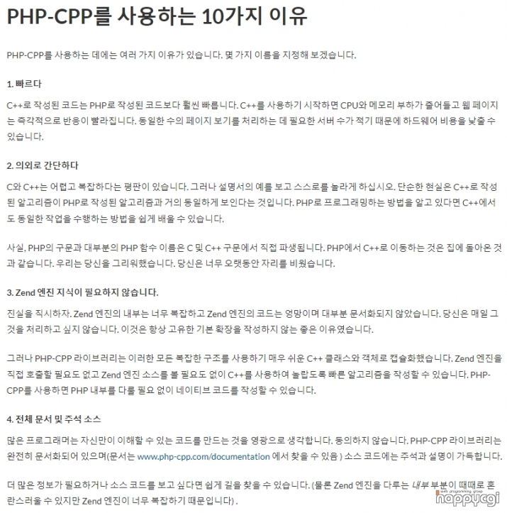 http://www.php-cpp.com/ 페이지로 접속하여 PHP-CPP 를 사용해야 되는 이유를 볼 수 있습니다.