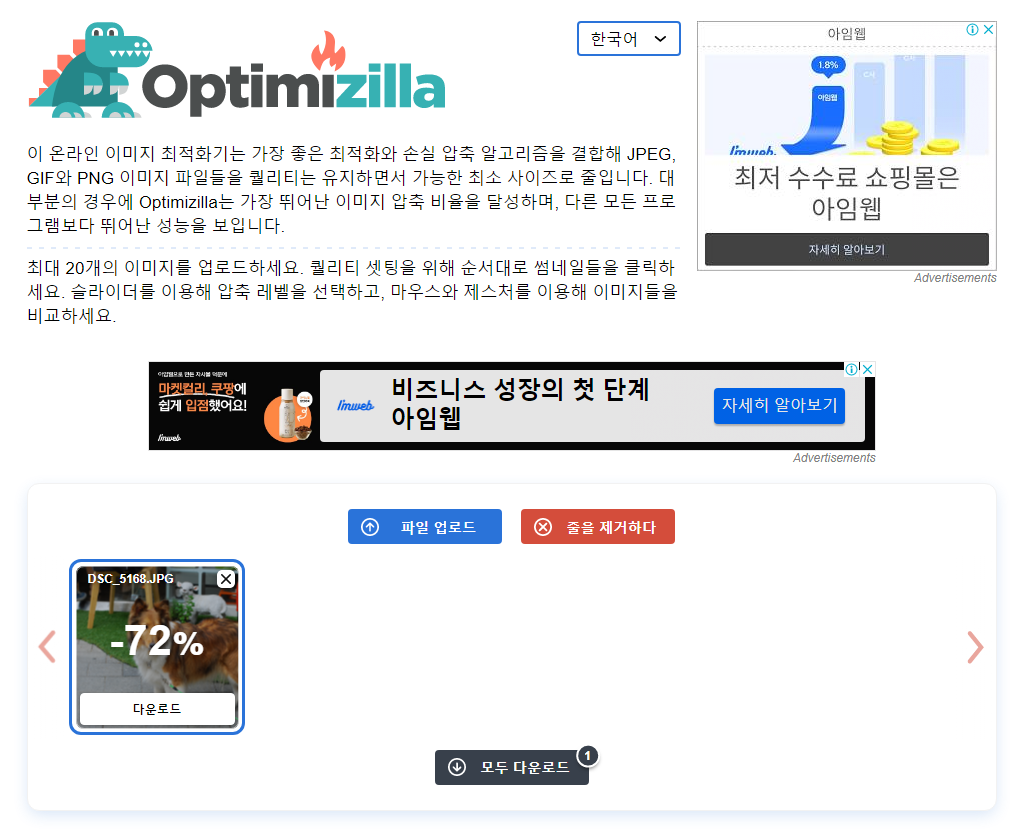 최적화할 이미지를 업로드 하면 자동으로 최적화된 이미지로 변환되어 다운로드가 가능합니다.