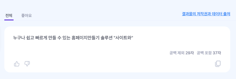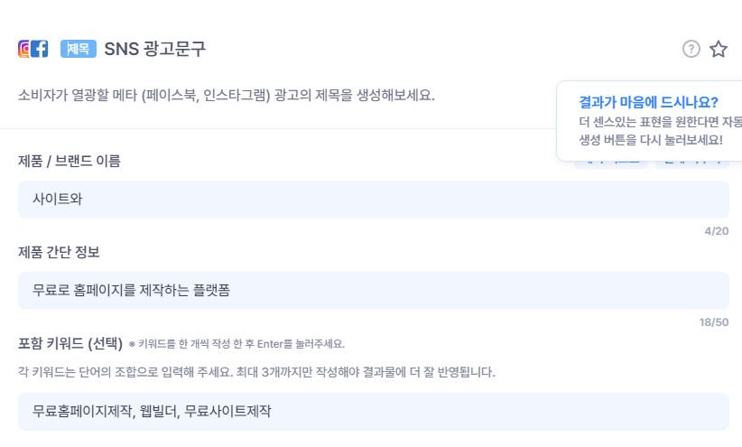 간단한 소개와 몇가지 키워드 등을 입력하면, 자동으로 꽤나 쓸만한 카피를 제공해줍니다.