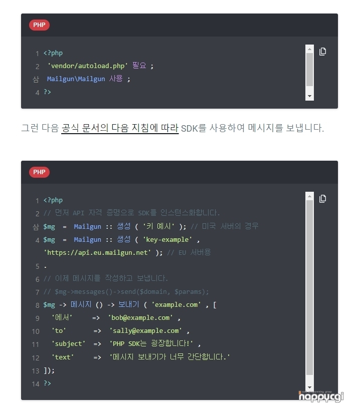 위 페이지에 접속하시면 PHP에서 Mailgun을 연동하는 방법을 상세히 배워보실 수 있습니다.