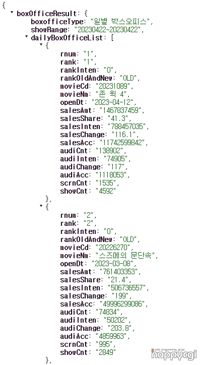 위 형태의 URL에 접속하여 보면, 아래와 같이 2023년 4월 22일 일별 박스오피스 데이터를 JSON 형태로 조회할 수 있습니다.