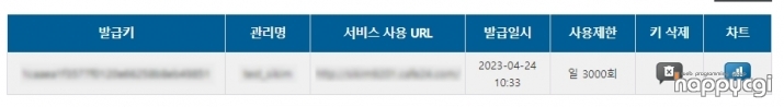 회원가입 후, 아래처럼 키 발급신청을 하여 발급 받아 API에 이용하시면 됩니다.