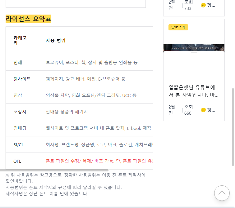 폰트 상세페이지에 접속해보시면 라이선스에 관련하여 확인하실 수 있으니