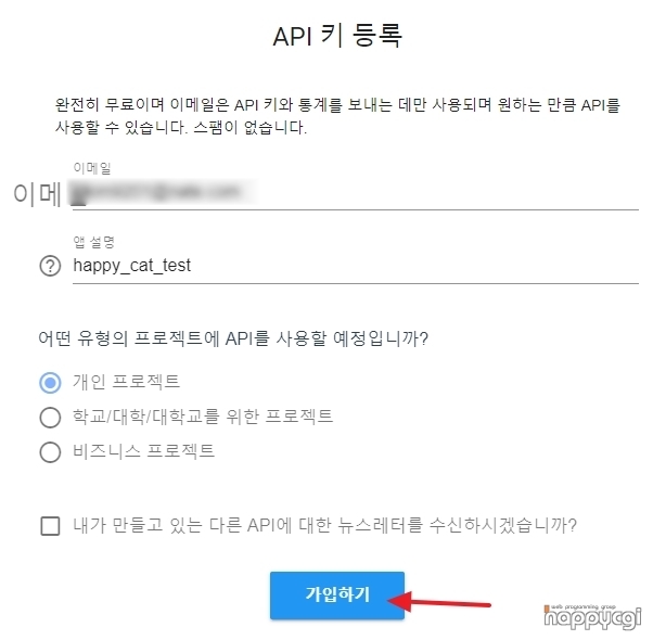 - 위 메뉴에서 '무료 가입'을 클릭한 후 이메일과 앱 설명, 사용할 예정인 프로젝트 유형을 선택 후 '가입하기'를 클릭하시면