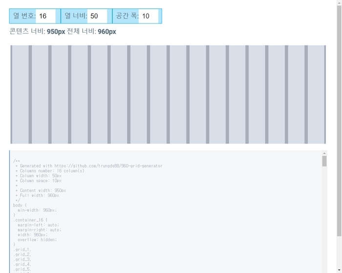 해당 사이트에서 그리드의 열 번호, 열 너비, 공간 폭 등 다양하게 테스트해보세요.
