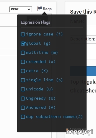flags 버튼을 클릭하여 정규식 옵션 지정을 할 수 있습니다.