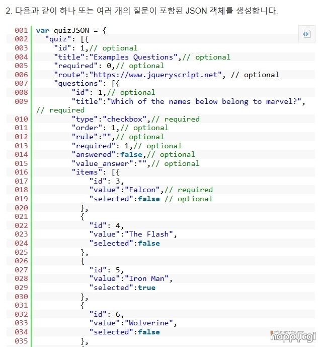질문지와 선택지에 대한 데이터포맷을 확인할 수 있습니다.