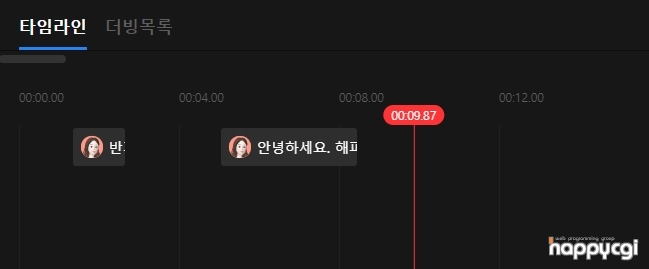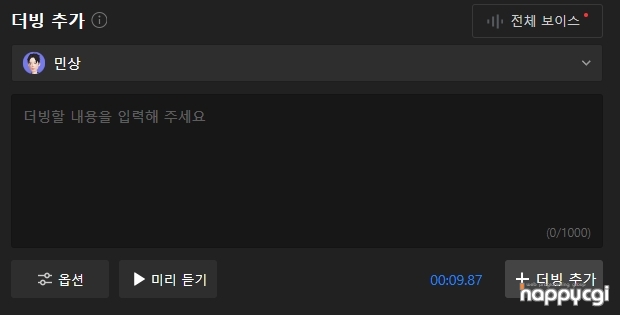 목소리를 선택 하여 미리듣기 혹은 더빙추가를 할 수 있습니다.