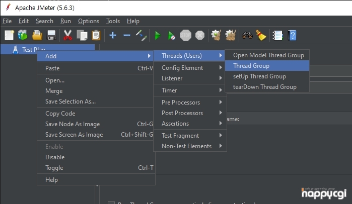 Text Plan 에 마우스 우클릭하여 Thread Group 까지 선택합니다.