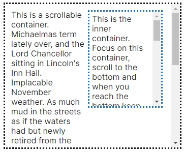 웹페이지에서 사이드메뉴, 사이드바 또는 컨텐츠 안의 또다른 영역에 스크롤바가 있을경우 해당부분을 스크롤 하다가 스크롤이 더 이상 안되는 부분에서 스크롤이 부모 요소로 전달되는 것을 방지하고 싶을때 사용합니다.