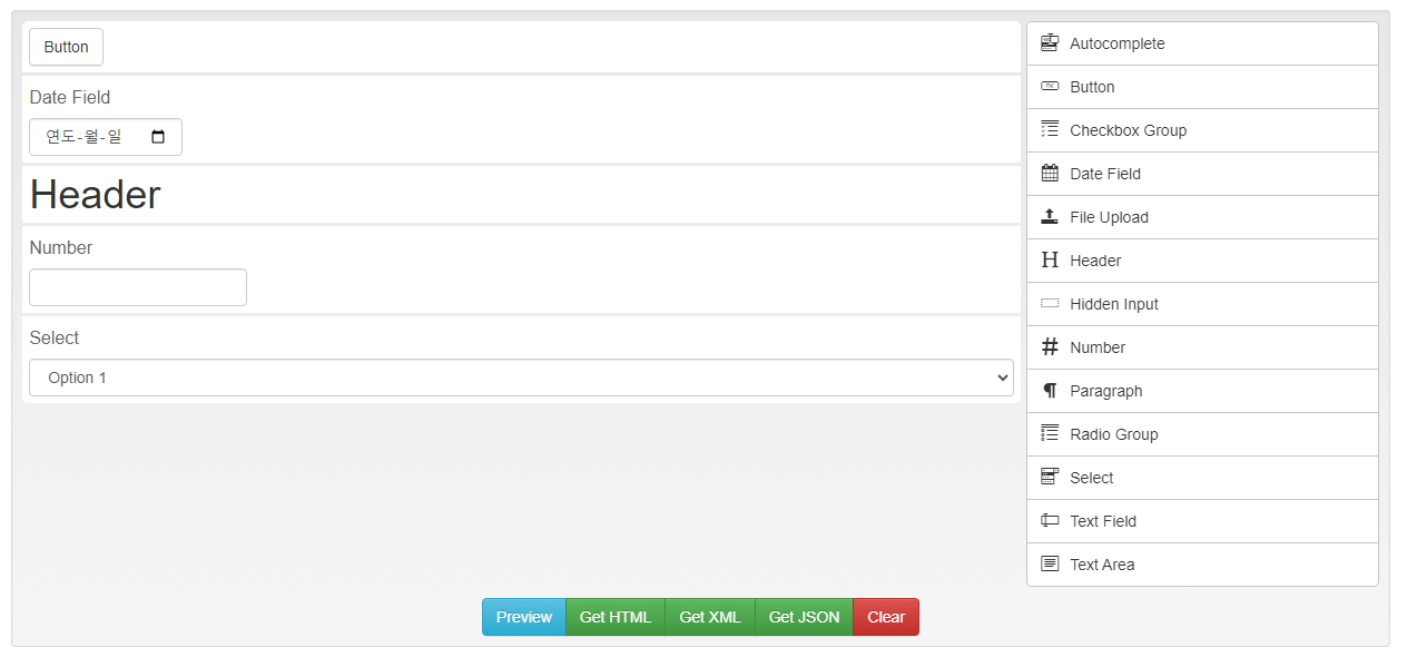 자동완성 폼, 버튼, 달력, 숫자 폼, 선택박스, 라이오버튼 등 원하는 폼을 선택하고