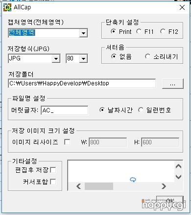 올캡(AllCap) 프로그램은 원하는 캡쳐 영역지정, 여러 저장 파일 포맷지원, 단축키 설정변경, 캡쳐 후 메모 편집, 웹페이지 이미지 저장 , 동영상 Animated Gif(움짤) 저장이 가능한 프로그램입니다.