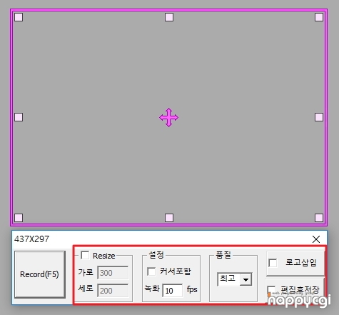 사이즈 조절(Resize), 영역내 마우스 커서 포함 여부, 품질, 로고 삽입, 편집 후 저장 설정을 할 수 있습니다.