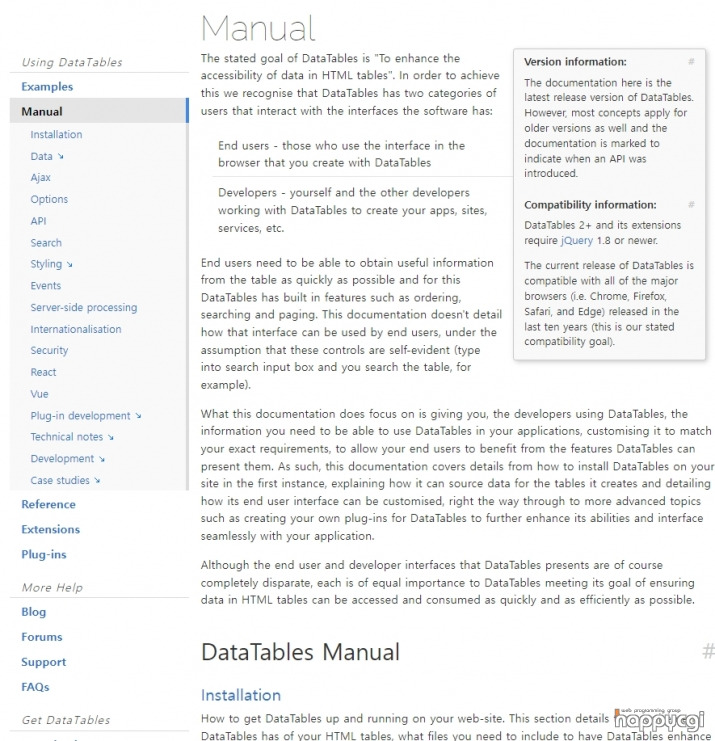 사용 메뉴얼은 https://datatables.net/manual/index 페이지에서 제공 되고 있습니다.