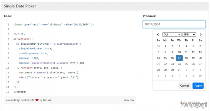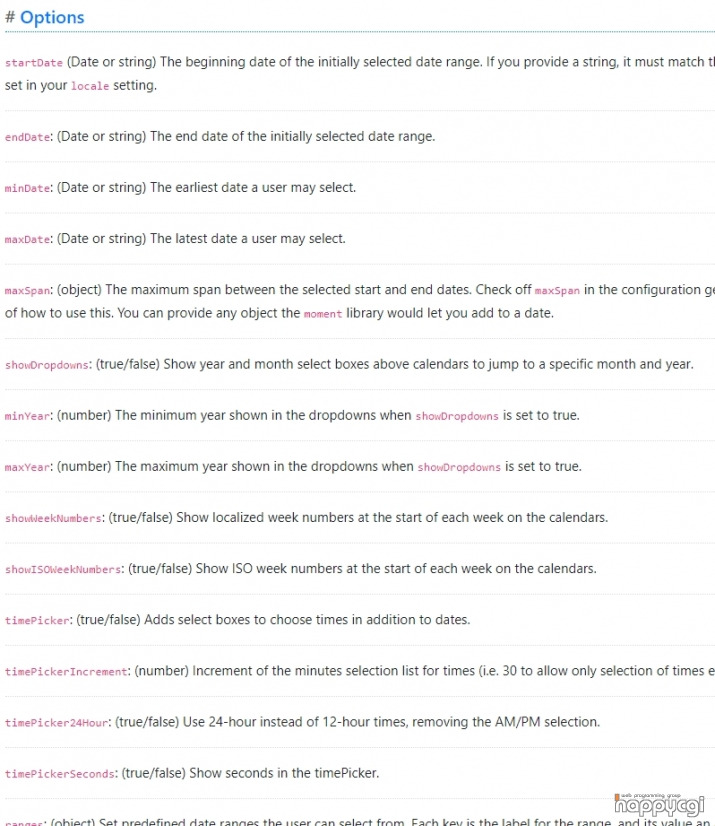 각종 제공되는 옵션들도 https://www.daterangepicker.com/#options 페이지에서 같이 확인이 가능 합니다.