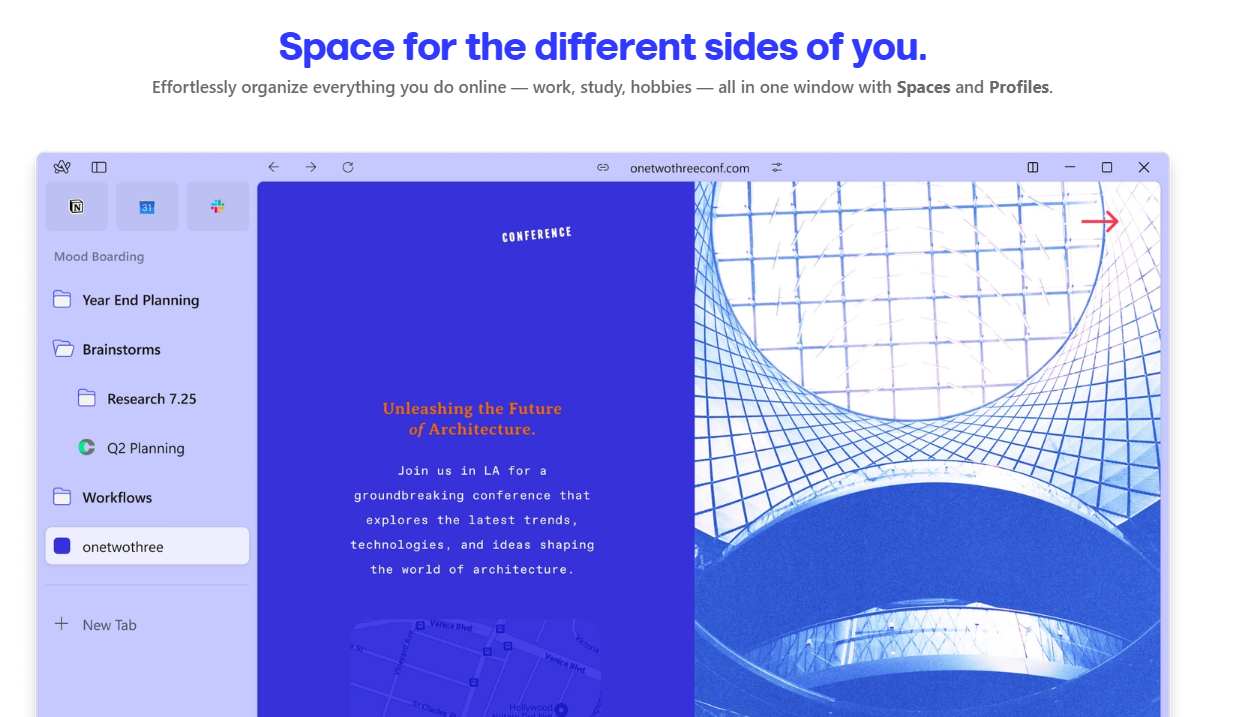 아크 브라우저는 상단 탭바가 없다. 대신 사이드바가 제공하며, 다양한 작업을 하다가 중요한 작업으로 돌아갈때 사이드바에 고정하여