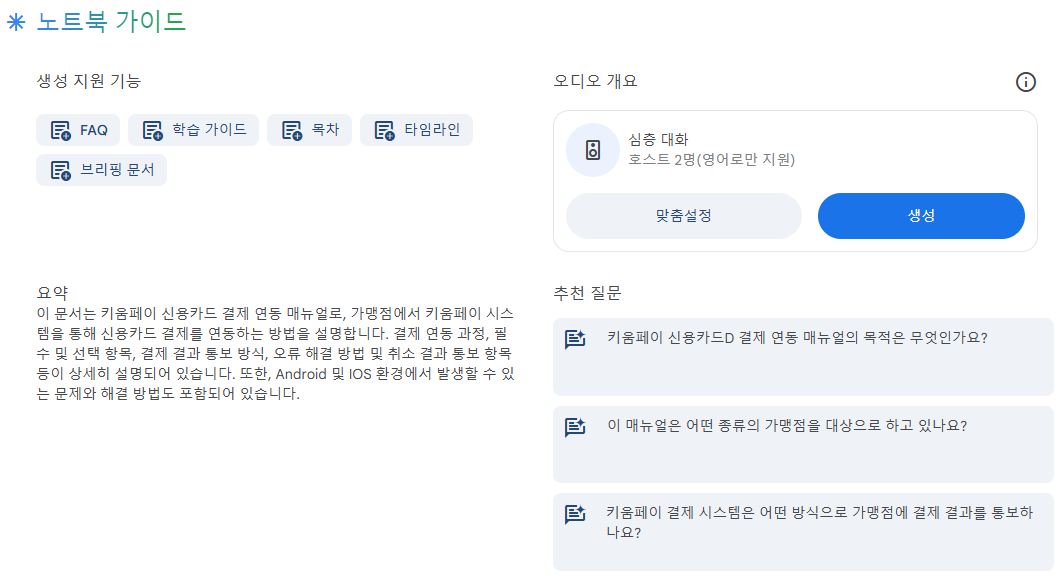 제가 키움페이 결제연동 메뉴얼 PDF 를 업로드 해보니 요약과 추천 질문들을 생성해주었습니다.