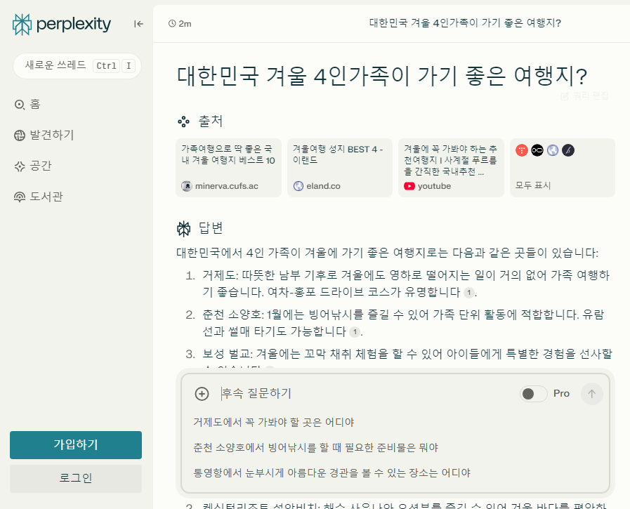 다만, perplexity는 검색 과 정보 제공에 집중된 AI 서비스입니다. 여러 웹사이트 및 출처를 기반으로 정보르 빠르고 효율적으로