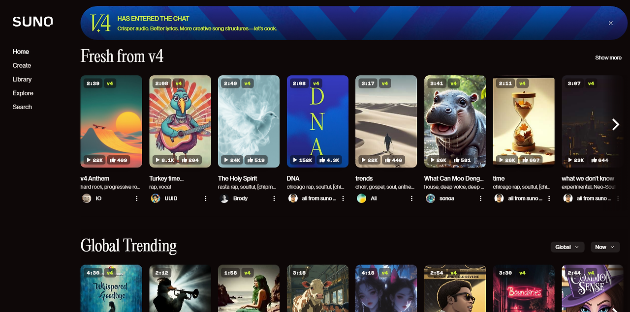 다른 음악 생성 AI와 달리 보컬의 음성까지 정확히 생성하며, 오디오 질이 떨어지는 것 빼곤 좋다.