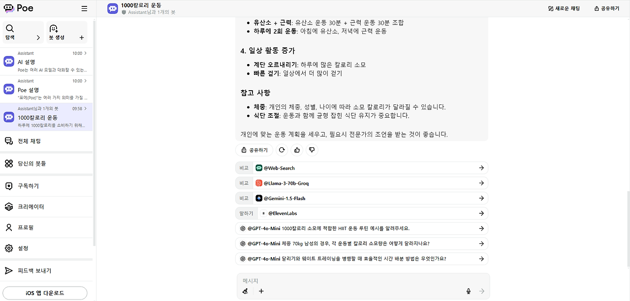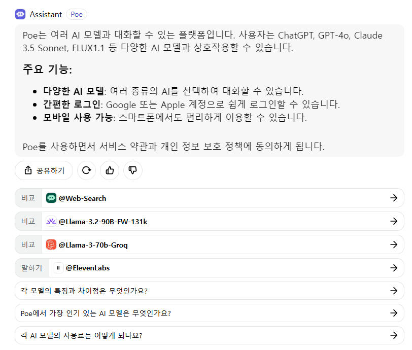 Poe는 여러 AI모델과 대화할 수 있는 플랫폼입니다. ChatGPT, GPT-4o, Claude 3.5 Sonnet, FLUX1.1 등 다양한 AI 모델과 대화하고 정보를 확인해보세요.