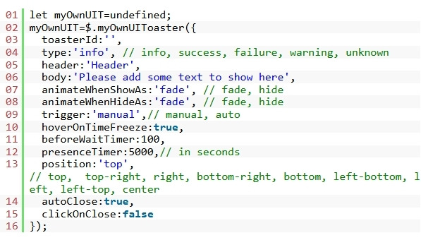 2. 새 myOwnUIToaster인스턴스를 만들고 다음 옵션을 전달하여 토스트의 모양과 동작을 구성합니다.