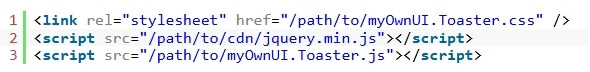 1. jQuery 라이브러리가 로드된 HTML 문서에 myOwnUIToaster CSS 및 JavaScript 파일을 추가합니다.