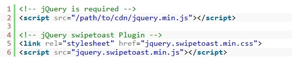 1. 문서에 최신 jQuery 라이브러리가 로드되었는지 확인하세요. 그런 다음 SwipeToast의 CSS 및 JavaScript 파일을 포함합니다