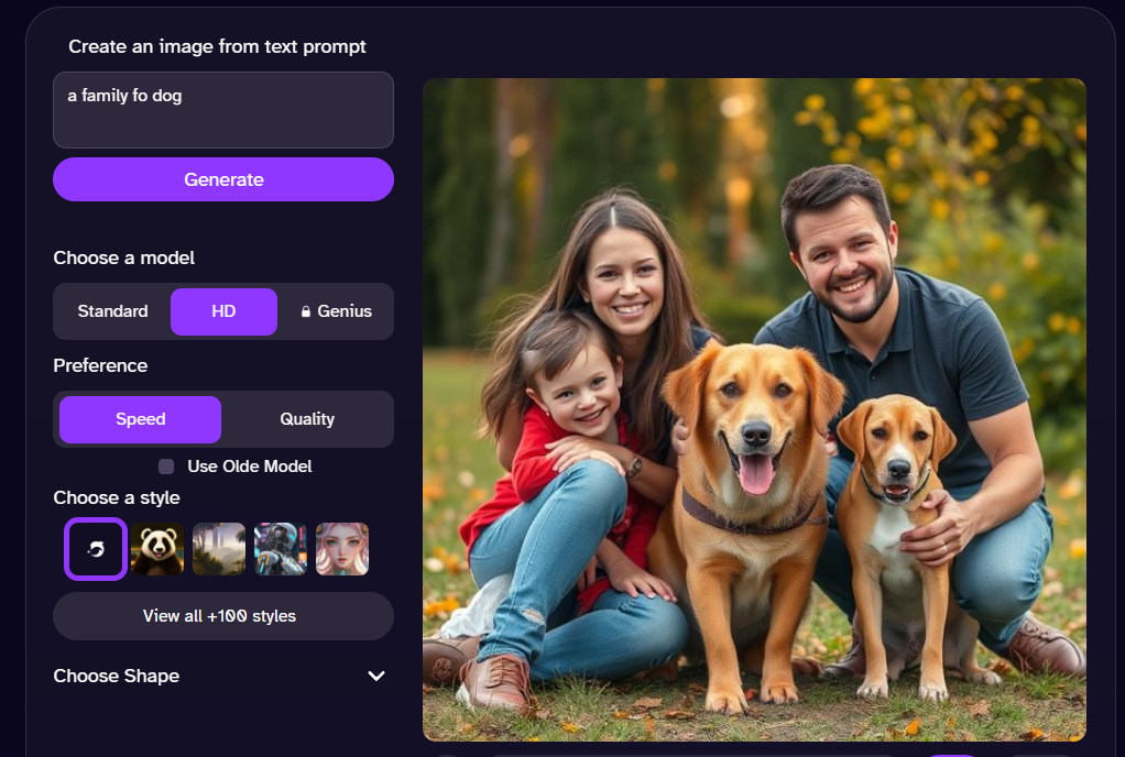왼쪽 탭을 통해 품질, 다른 스타일 선택, 이미지 모양 등 다양한 기능 이용이 가능합니다.