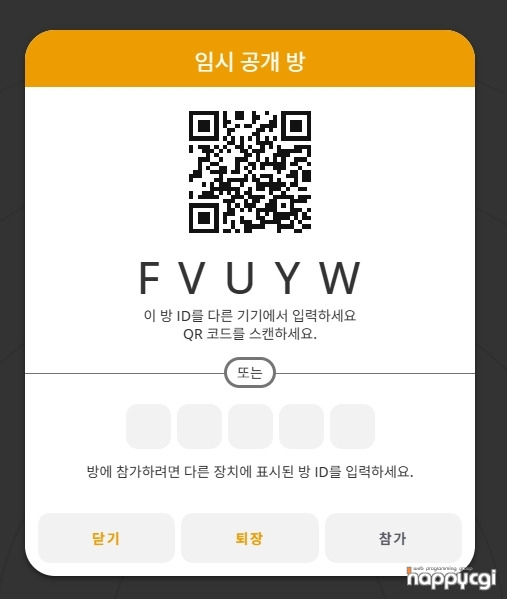 이 코드를 안 사람이라면 누구든 해당 방에 접속할 수 있습니다.