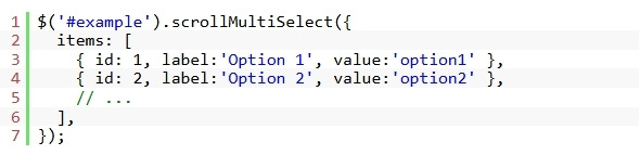 3. 컨테이너 요소에서 플러그인을 초기화하고 id, label, value 속성을 사용하여 객체 배열에서 옵션을 정의합니다.