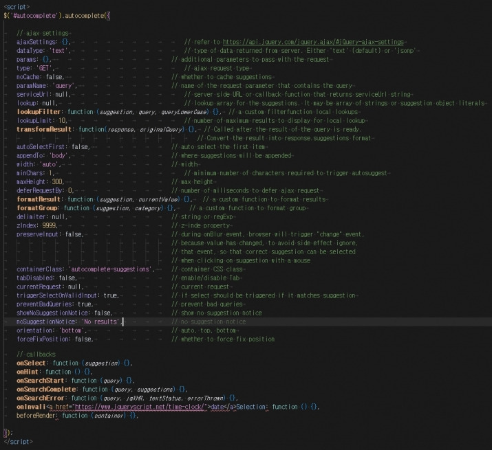 jQuery.Autocomplete 는 사용자가 텍스트를 입력할 때 텍스트 입력 필드에 AJAX 조회 기능을 갖춘 자동완성/자동제안 드롭다운 목록을 첨부하는 jQuery 기반 자동 완성 플러그인입니다.