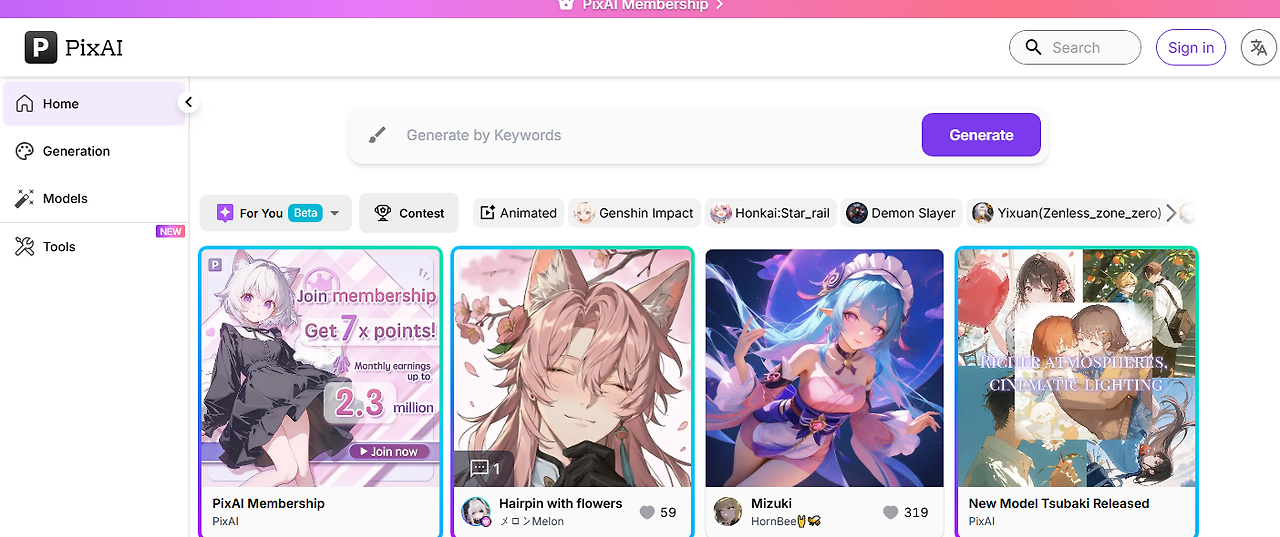 pixAI는 AI 애니메이션 팬아트, 초상화, 일러스트레이션 등 다양한 애니메이션 생성 AI 입니다.