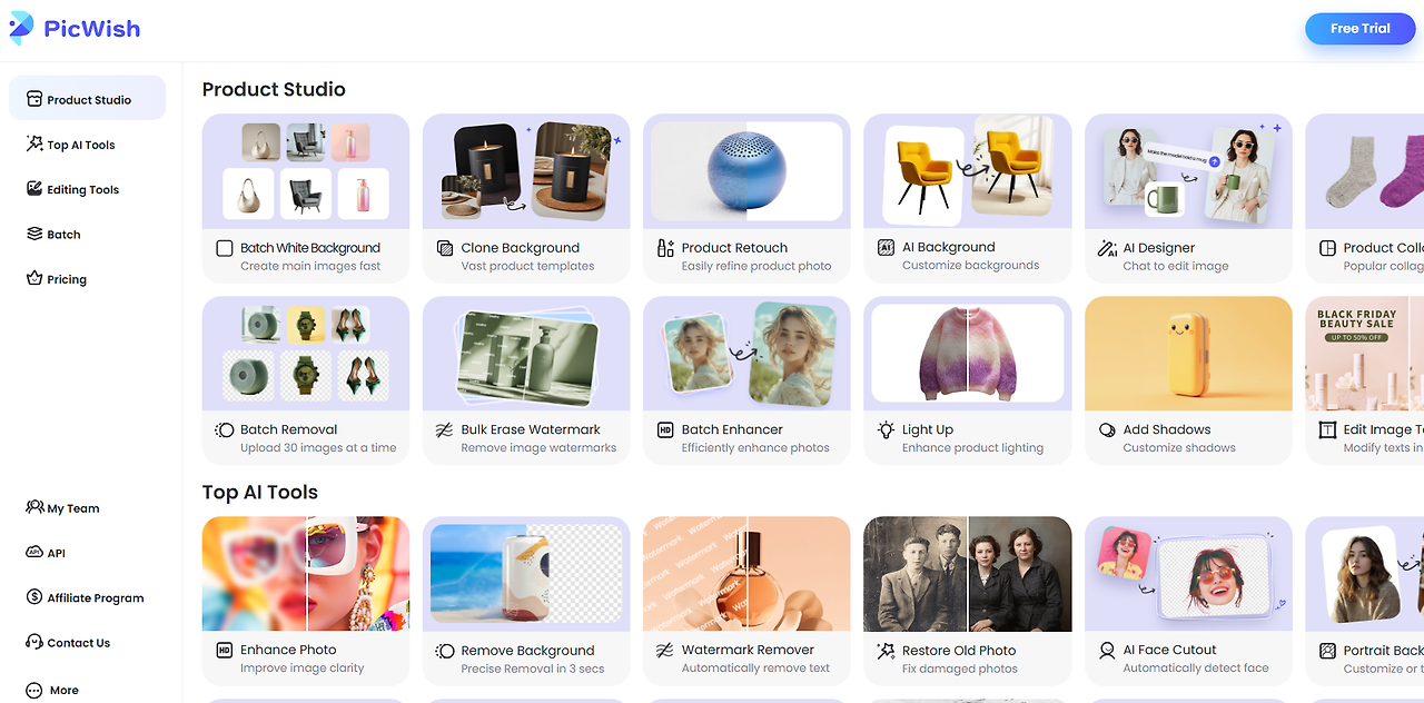 배경 자동제거, 이미지 편집, 저화질 혹은 흐린 이미지 보정 등 AI를 활용한 이미지 편집처리 플랫폼 picwish입니다.