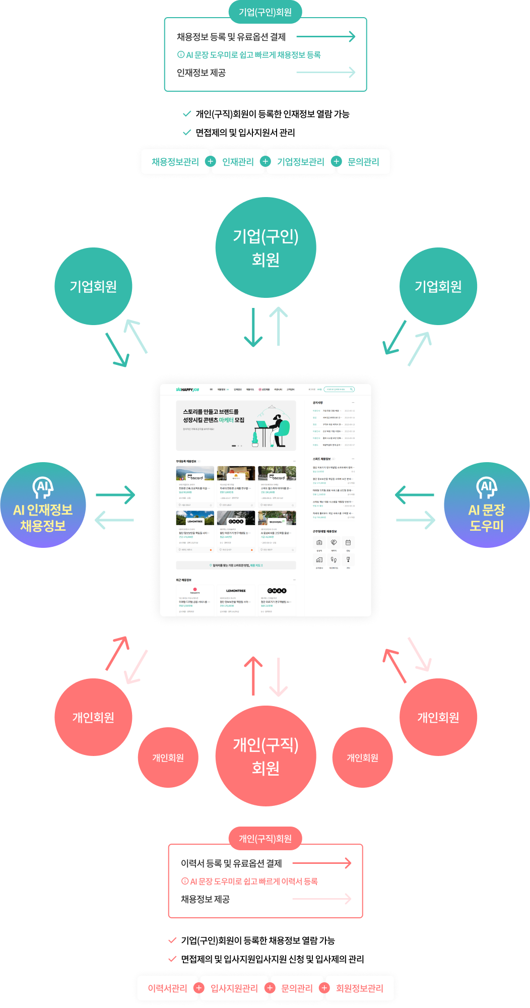 채용정보 등록, 이력서 열람, 지원 관리, 유료 공고 등